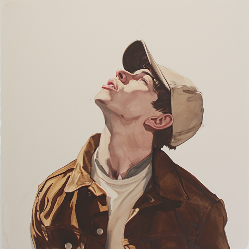 A loose gouache painting of a man in a brown suede jacket wearing a cream baseball cap, . backlighting. looking up and to the side. Mouth slightly open. --v 6.0 --s 50