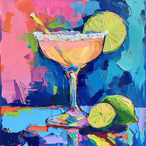 acrylic painting style, a margarita glass with a margarita in it and a salted rim, bright background colors --ar 9:16 --v 6.0