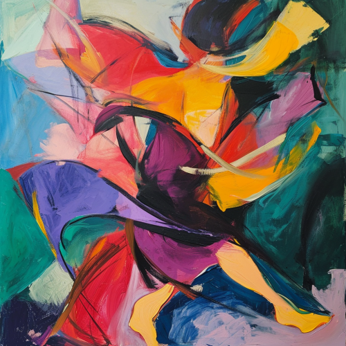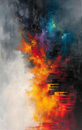 Describe an abstract painting that begins with a calm and monochromatic gray scale at the top, which gradually descends into a vibrant and chaotic blend of warm colors with energetic brushstrokes at the bottom, representing a shift from tranquility to turbulence --ar 10:16 --s 250 --v 6.0