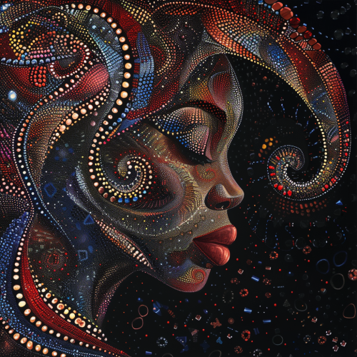 dots, dotpainting, an abstract painting of a woman with a spiral, in the style of nene thomas, dark indigo and crimson, 8k resolution, i can't believe how beautiful this is, elaborate beadwork, dark red and light red, afrofuturism --v 6.0