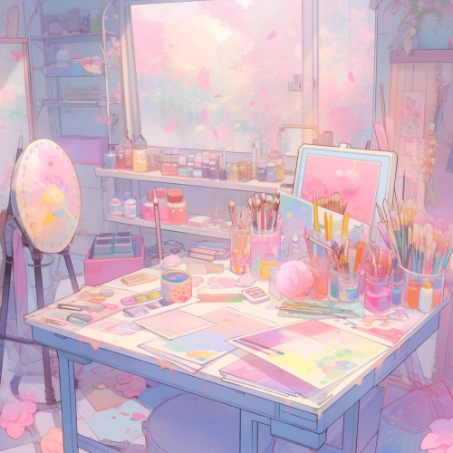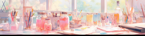 an artsy painted banner in fun pastel colors, with an open blank sketchbook displayed, books stacked on the table, and paintbrushes and colored pencils in glass mason jars, an artist's studio, magical, i can't believe how beautiful this is --niji 5 --ar 4:1