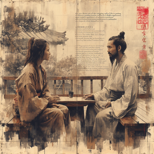 "An Asian doctor and patient in the style of Chinese painting engaging in conversation, emphasizing the doctor's role, depicted with multiple expressions and continuous movements, against a white background in minimalist style.":: : 16:9 --v 6.0 --s 750