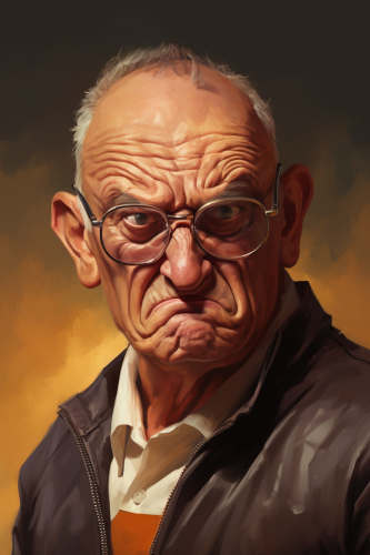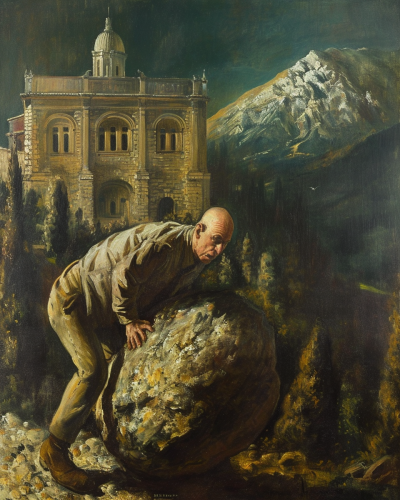 A bald college professor pushing a very large rock up a very steep hill in hell, like sisyphus, in front of a university building, in the style of an old master painting --ar 4:5 --v 6.0
