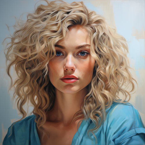 a painting of a beautiful artist with curly blonde hair, she has been painting, and is wearing a light blue shirt, pastel colors