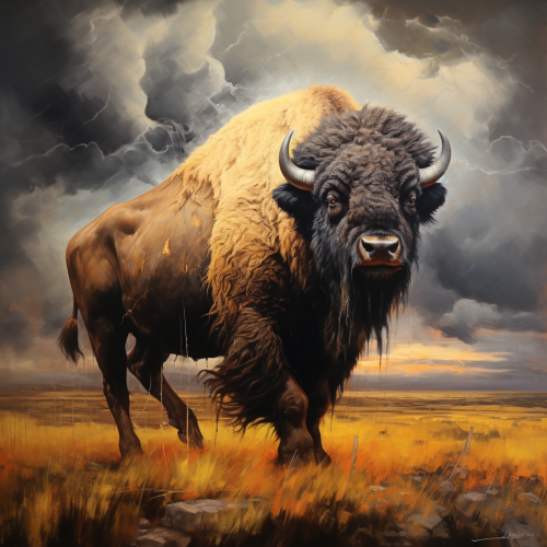 painting in the style of Bill Anton of an American buffalo on the open plains with a large thunderstorm rolling in the distance