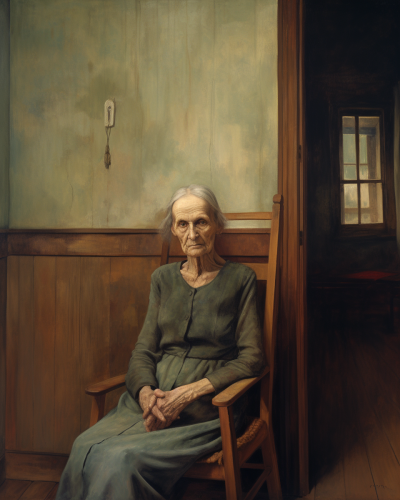 a brooding sullen old woman sits in a wooden chair in a shabby room at dusk staring out the window, oil painting by balthus --ar 4:5 --s 50