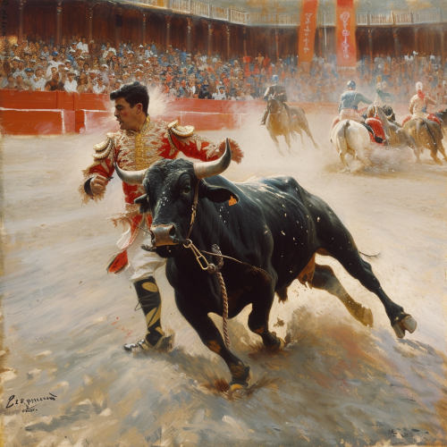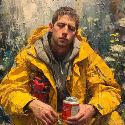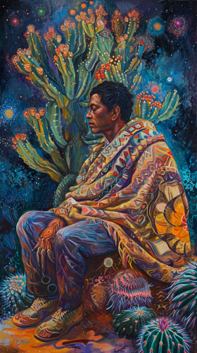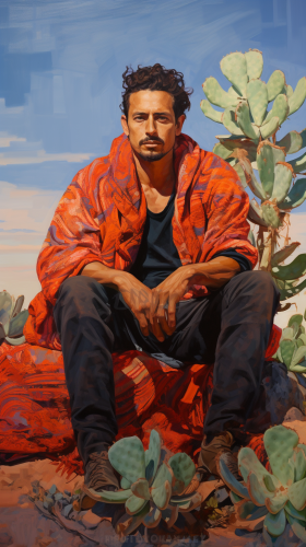 a handsome hispanic man wearing a blanket and sitting on a giant cholla cactus. The cactus is fruiting and coloful. Expressive imprssionistic painting --ar 9:16 --v 6.0