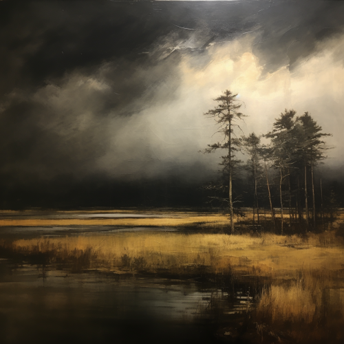 Chiaroscuro moody tonal landscape of lake and trees in the field with stormy dark sky minimal photorealistic painting edgar payne