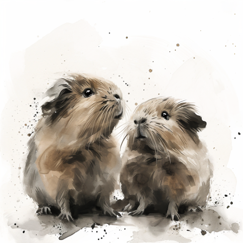 A painting of two cute brown guinea pigs which are looking to the top, black and white, watercolor style, white background, The viewer only sees the animals' backs and bottoms. Capturing a curious expression, soft shading, high detail, brush splashes as an accent, 4:3 aspect ratio --v 6.0