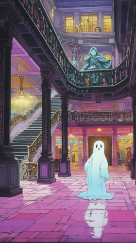 Colored Concept Drawing of a lonely cute ghost in an abandoned shopping mall from Fantasia (Walt Disney, 1999), dark fantasy, high detail, 1940s Disney, Disney animated film, cartoon, painting, colorful --ar 9:16