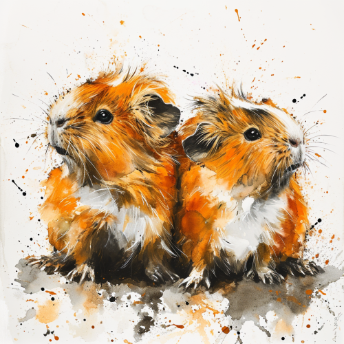 A high detail painting of two cute orange brown guinea pigs which are looking to the top, black and white, watercolor style, white background, The viewer only sees the animals' backs and bottoms. Capturing a curious expression, soft shading, high detail, brush splashes as an accent, 4:3 aspect ratio --v 6.0