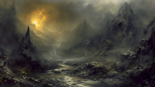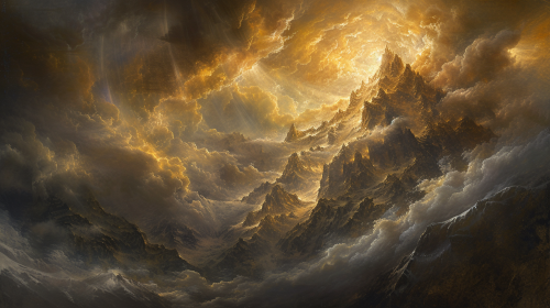 a painting of a mountain with cloudy skies, in the style of gothic dark and ornate, realistic chiaroscuro lighting, layered imagery, whirring contrivances, golden light, monochromatic chaos, medieval fantasy --ar 16:9 --v 6.0