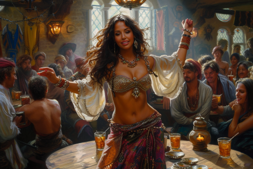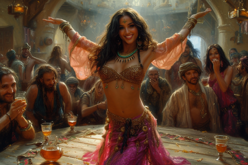 gorgeous tanned female belly dancer dynamic dancing on top of a round table in a medieval tavern surrounded by lots of people drinking rum and having a good time, detailed realistic oil painting style, --ar 3:2 --s 250 --v 6.0