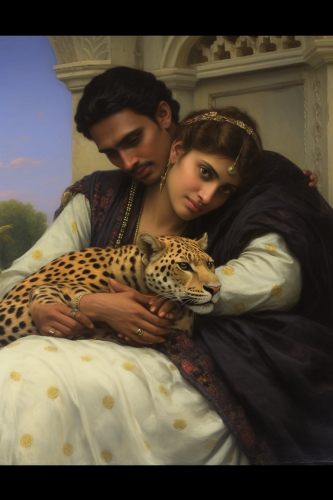 figure cuddling with her pet leopards, drama, romantic, tadema, bouguereau, lefebvre, --ar 2:3