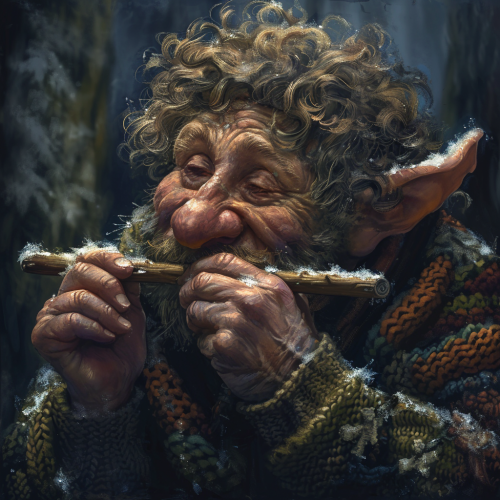 portrait of a forest gnome man, lazy eye, curly hair, young adult, large sideburns, large round ears, wearing an old medieval knitted jumper, bard, playing a small flute, oil painting, Frank Frazetta artwork style, HD, 8K, dramatic lighting, clear details, character design, --v 6.0