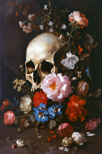 a painting by Rosso Fiorentino featuring a gothic skull with flowers coming out of the top, moody, dark colors --ar 2400:3600 --style raw --v 6.0