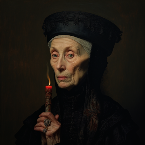 jan van eyck style oil painting of an older beautiful tattooed gothic victorian woman in profile, holding a lit match to her lips as if to blow it out