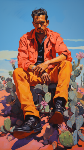 a handsome hispanic man sitting on a giant cholla cactus. The cactus is fruiting and coloful. Expressive imprssionistic painting --ar 9:16
