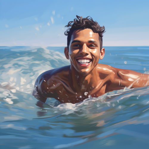 painting of adult Indian male swimming in the ocean on a beautiful day, happy and smiling, lightly tan skin, short hair, 1100px x 220px PNG