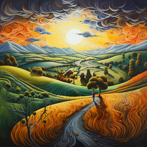 Painting of a landscape that shows the beauty and tranquility of nature::4 wind turbines::5 corn field::5 person appreciating the landscape::4 vibrant colors to infuse energy, texture with geometric shapes and random brush strokes::3 in the style of José Clemente Orozco::1