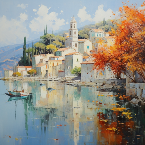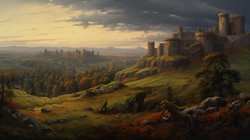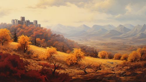 Oil painting. a group of majestic medieval fortresses scattered on a gentle hill on the right side of the picture. distant view. dusk. late autumn environment. forest in background. --ar 16:9