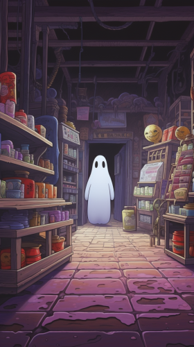 Colored Concept Drawing of a lonely cute ghost in an abandoned grocery store from Fantasia (Walt Disney, 1999), dark fantasy, high detail, 1940s Disney, Disney animated film, cartoon, painting, colorful --ar 9:16
