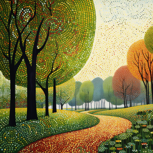 Take inspiration from Georges Seurat's Pointillism. Use small geometric shapes like dots or circles to form a nature scene, mimicking the vibrant and textured look of pointillist paintings.