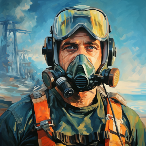Painted portrait. Finish male in tactical scuba gear. Special forces. Respirator and air tank. Off coast oil rig. Ocean background