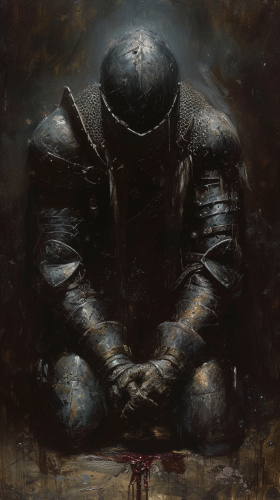 dark oil painting, Medieval Knight kneels prays, epic tone --ar 9:16 --v 6.0 --style raw --s 250