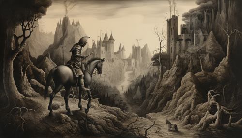 knight in armor on his horse meets a demon , painted in the manner of Pieter Bruegel the Elder, behind them a mountain with tall trees, a ruined castle at the summit, charcoal drawing --ar 7:4