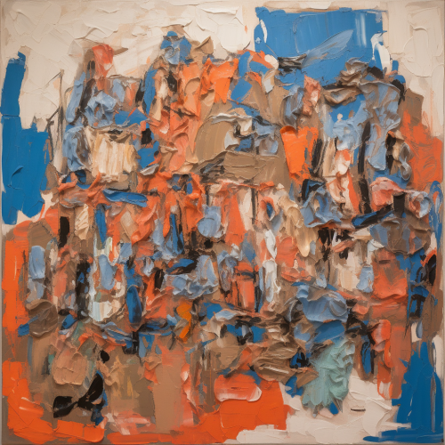 an abstract painting in the style of Phillip Guston, with hints of Africa. orange and blue palette --v 5.0