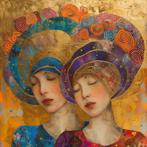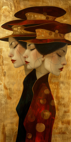 Allegorical mister darkness figures. Painting style Gustav Klimt. Oil paints, strokes, smears, canvas, in places in gold