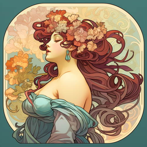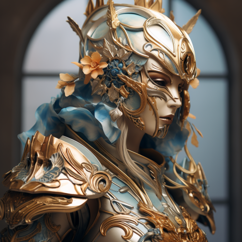 A lady knight in full decorative armor with the face cover of her helmet up so you can see her face painted in the style of Alphonse Mucha