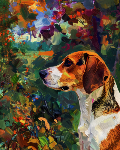 A commanding American Foxhound overseeing a lush farm, depicted with Van Gogh's intense colors, Dali's abstract forms, Monet's colorful landscapes, and Renoir's soft, diffuse light. Created Using: intense colors, abstract forms, colorful landscapes, soft diffuse light, commanding animal figure, lush farm setting, hd quality, natural look --ar 4:5 --v 6.0