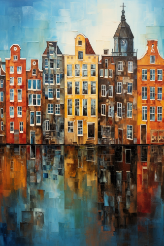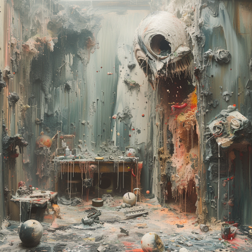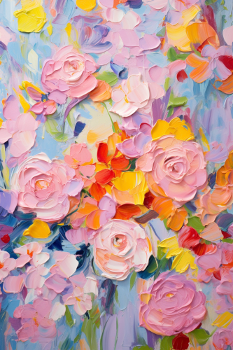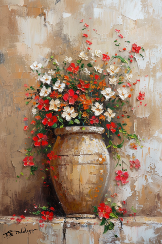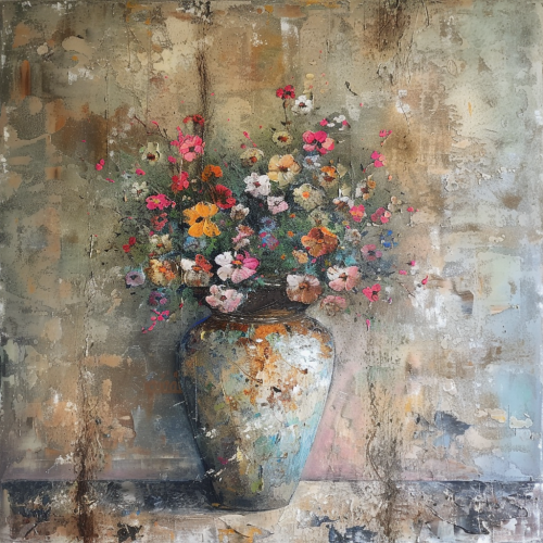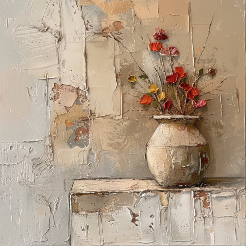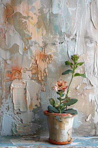 a large Ceramic pot filled with flowers, stucco wall background, Holly Irwin style abstract oil painting, palette knife heavy detail and texture --ar 1:1 --v 6.0