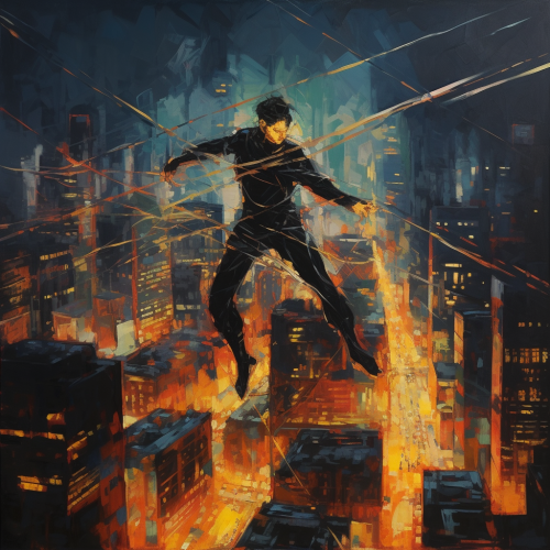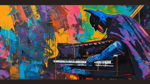psychedelic painting of Batman playing piano. He is African American. --ar 16:9 --v 6.0