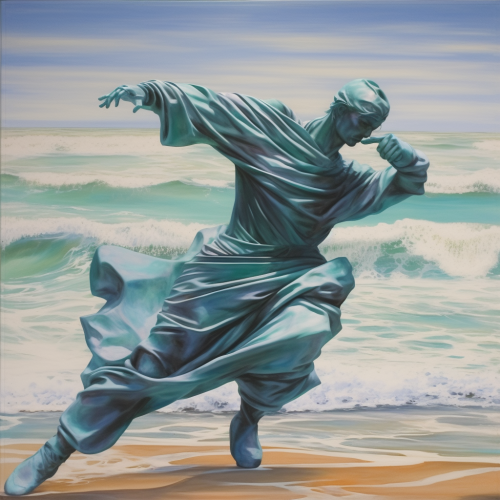 In a serene beach setting, dancing with a scarf made of floating waves. Michelangelo-style artwork, depicting the dance with powerful muscle expressions, an idealized human figure, dynamic poses, and a touch of dramatic elements. Infused with the sculptor's influence, the painting conveys a unique three-dimensional feel on the flat canvas.