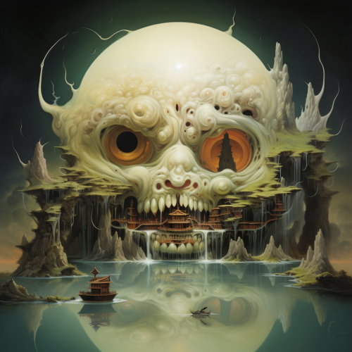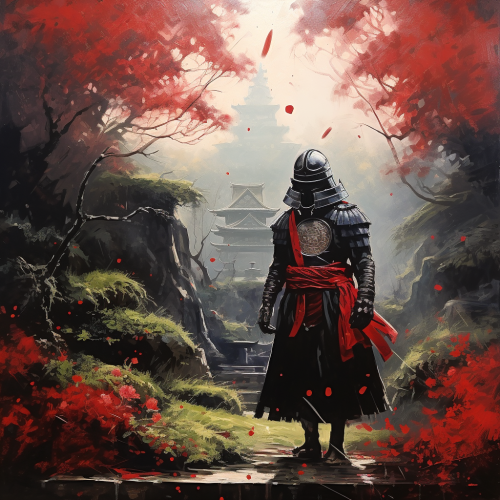 Painting of a traditional japanese samurai, unique japanese mask and armor, black and red armor, 1970's surrealist dark fantasy art style, book cover art, realist: lifelike accuracy, volumetric lighting, japanese garden and temple background, --style raw --ar 1:1