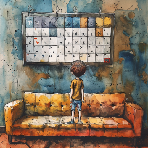 A boy stands on a sofa and looking at a calendar on the wall, cartoon, watercolor --v 6.0