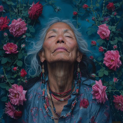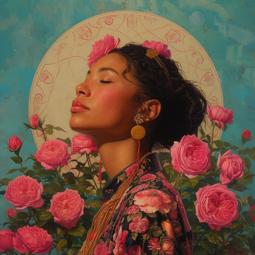 enlightened Chief medicine woman, Thomas Blackshear style, oil painting, pink roses, teal background, James Jean Style, dramatic lighting --v 6.0 --s 750