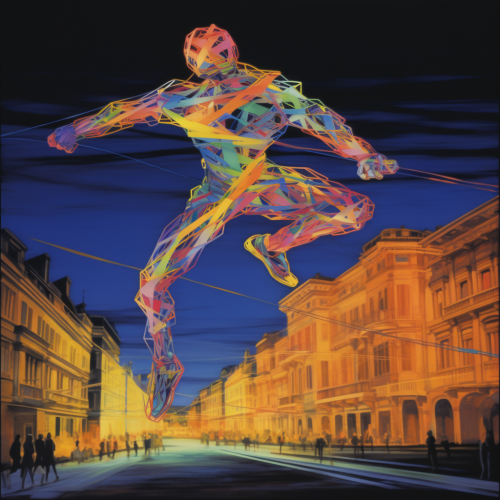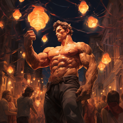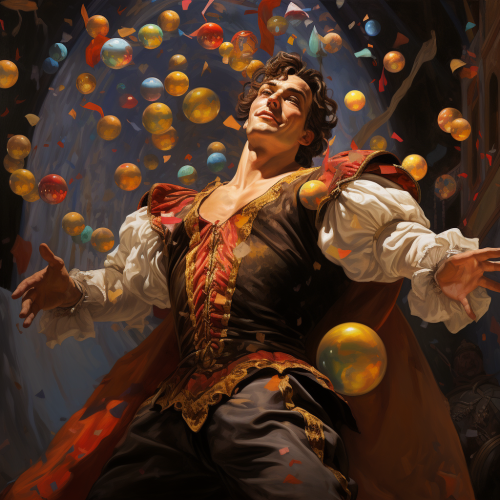 Within a bustling circus tent, juggling with balls made of floating confetti. Michelangelo-style artwork, portraying the act with robust muscle representations, an idealized human form, dynamic poses, and a hint of dramatic flair. Inspired by the sculptor, the painting introduces a distinctive approach to capturing three-dimensionality on the canvas.