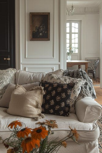a clean european living room with a small black and white painting behind the sofa, --ar 2:3 --v 6.0 --s 750