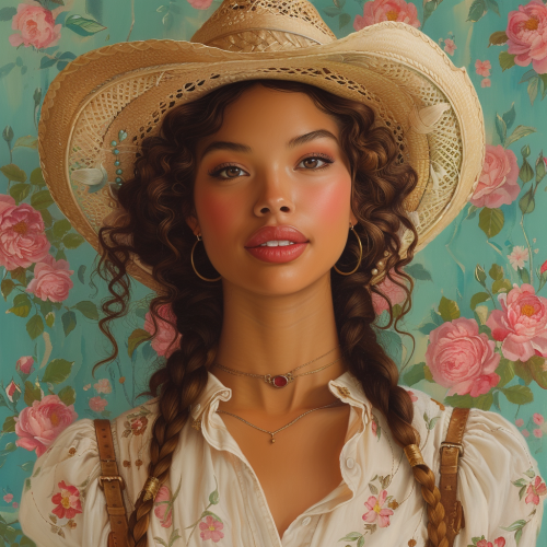 cowgirl, Thomas Blackshear style, oil painting, pink roses, teal background, Archibald Motley style --v 6.0 --s 750