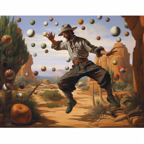 In a serene desert oasis, juggling with balls made of floating sand particles. Michelangelo-style artwork, capturing the act with powerful muscle expressions, an idealized human form, dynamic poses, and a touch of dramatic flair. Infused with the sculptor's influence, the painting conveys a unique three-dimensional feel on the flat canvas.
