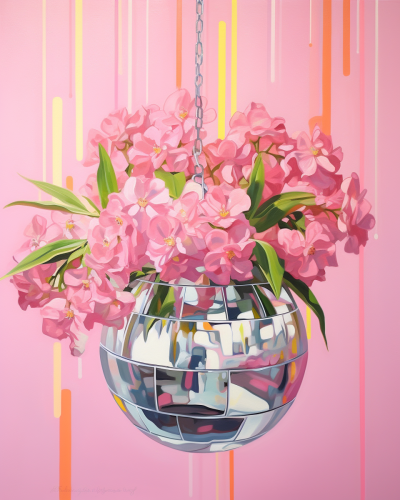 oil on canvas, silver disco ball hanging planter, modern flowers, on a light pink background --ar 4:5