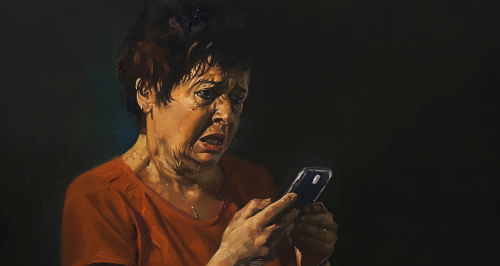 an oil painting using heavy broad strokes of a 50 year old woman with short dark brown hair who is distraught and holding her phone while sitting in a dark room. --ar 127:68 --v 6.0 --s 50