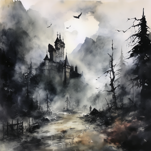 a dark and atmospheric watercolour of Dracula's castle in the mist, vampire in the foreground