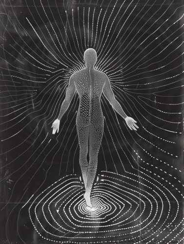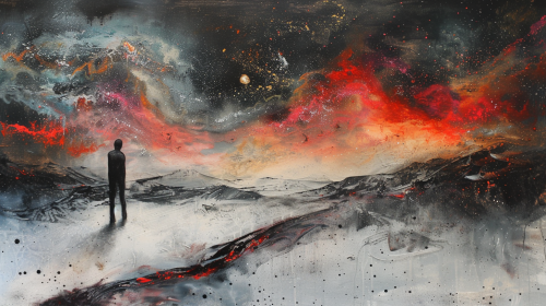 graceful relaxing painting of grey, black and red lands, creepy style with a figure standing looking at the entire colorful universe vividly --ar 16:9 --v 6.0