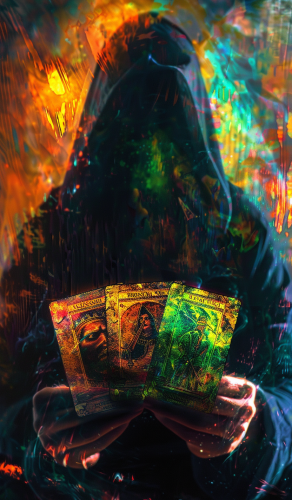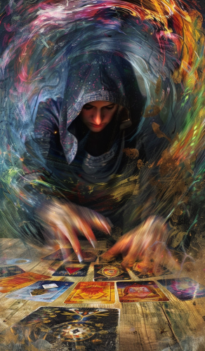 grimdark necromunda style emperors tarot card painting, hooded blurry woman facing forward with a spread of five Emperor’s Tarot cards arranged on a table Representing the God-Emperor’s will made manifest with swirling colored energy around her, abstract, painterly James Abbott McNeil Whistler style with visible brush strokes --ar 7:12