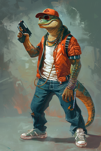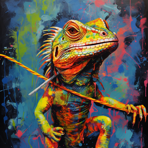 a lizard tied and hanging from a hook, in psychedelic colors, hand painted in expressionist technique